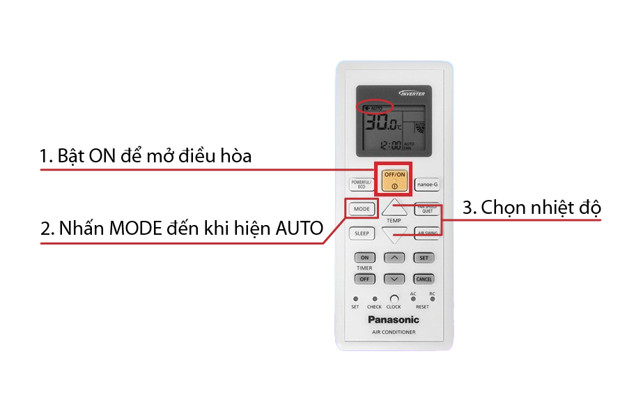 Bước 2️⃣ Nhấn nút Mode đến khi màn hình hiển thị Auto